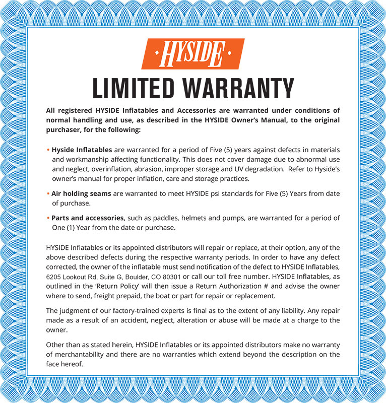 HYSIDE’s goal is to provide you with a product that won’t leave you worrying about a warranty. Warranties won’t help you in remote locations or on the river. That said, if you do have any issues, please see the Terms and Conditions below, as well as our Limited Warranty and Limited Liability (our lawyers made us do it).