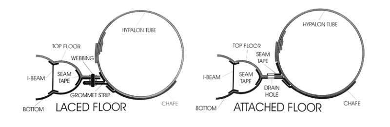 Inflatable floors are either glued in or laced-in with webbing, through grommets, when attached to the main tubes. We transitioned to the “attached” self-bailing floor back in 2000 for all stock models, due to ease of use and maintenance for the customer, however, we still produce Lace-in floors, especially for international clients who need to break down the boats for transport.