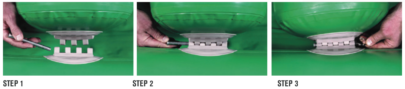 12. Fully deflate chamber and place on firm surface. (If repairing a tear or installing footcones, you’ve already done this). Using a roller, roll all areas of the patch to ensure surface contact to all areas. Working from the center towards the outside, use the roller to work out any wrinkles or bubbles.