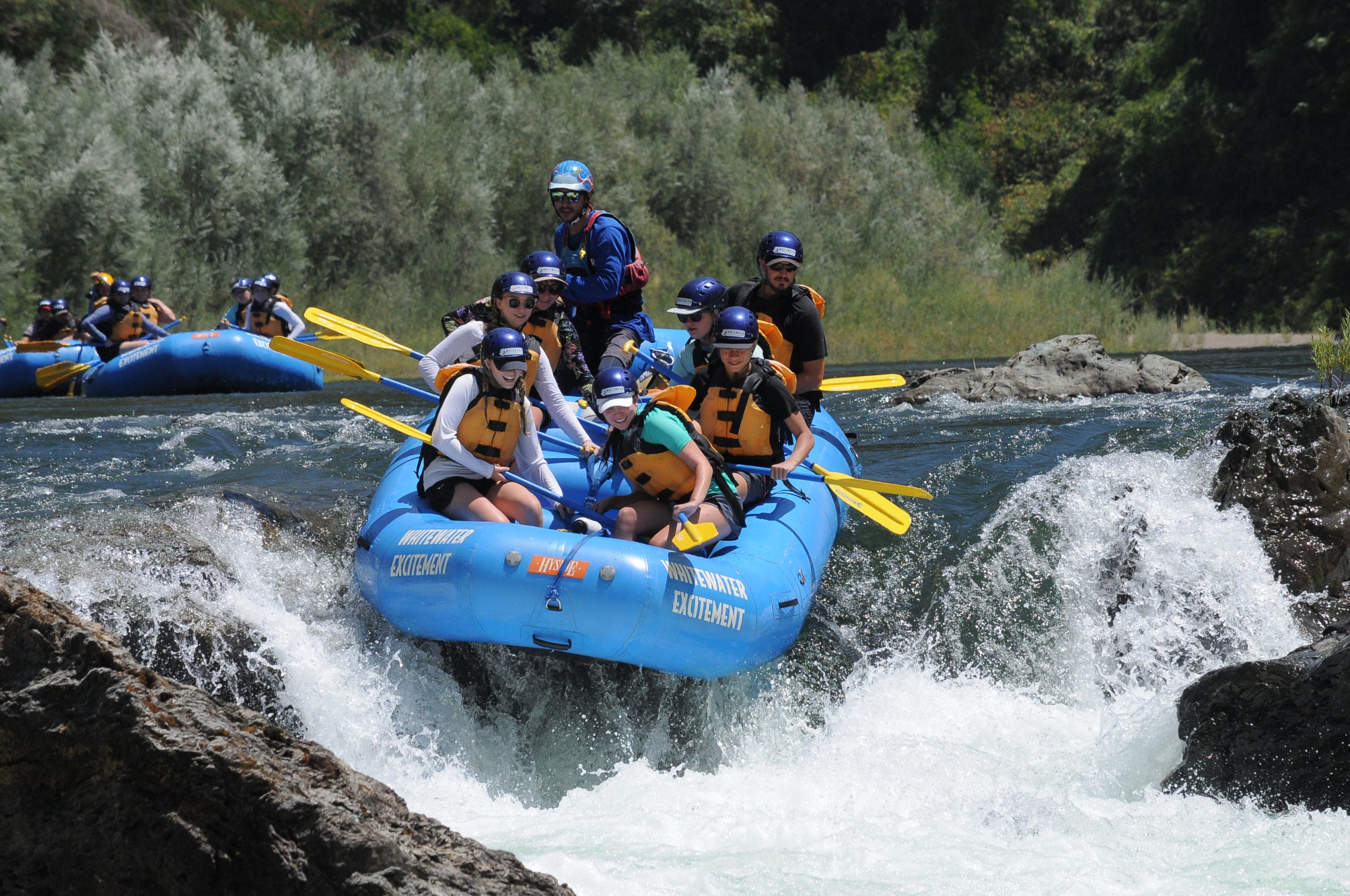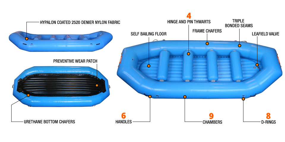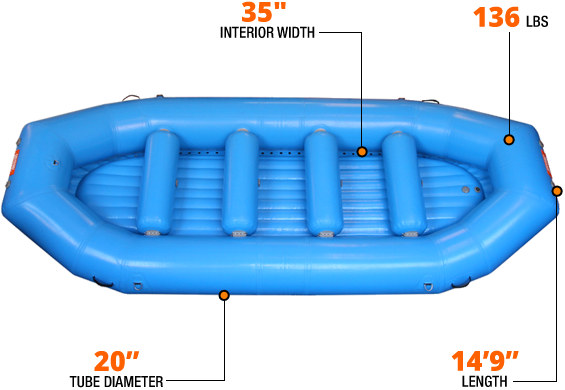 It’s very common to get bookings that add up to 8 plus, but few boat designs will handle them. On California’s American River, where class III and busy weekends are the norm, this 4 thwart people mover was developed. Not much bigger than the other boats on the river but very helpful when extra boats and guides are scarce. At almost 15 feet long, this boat is actually 8” more narrow than our PRO 14. This design gives those bigger boat loads increased maneuverability without sacrificing comfort.